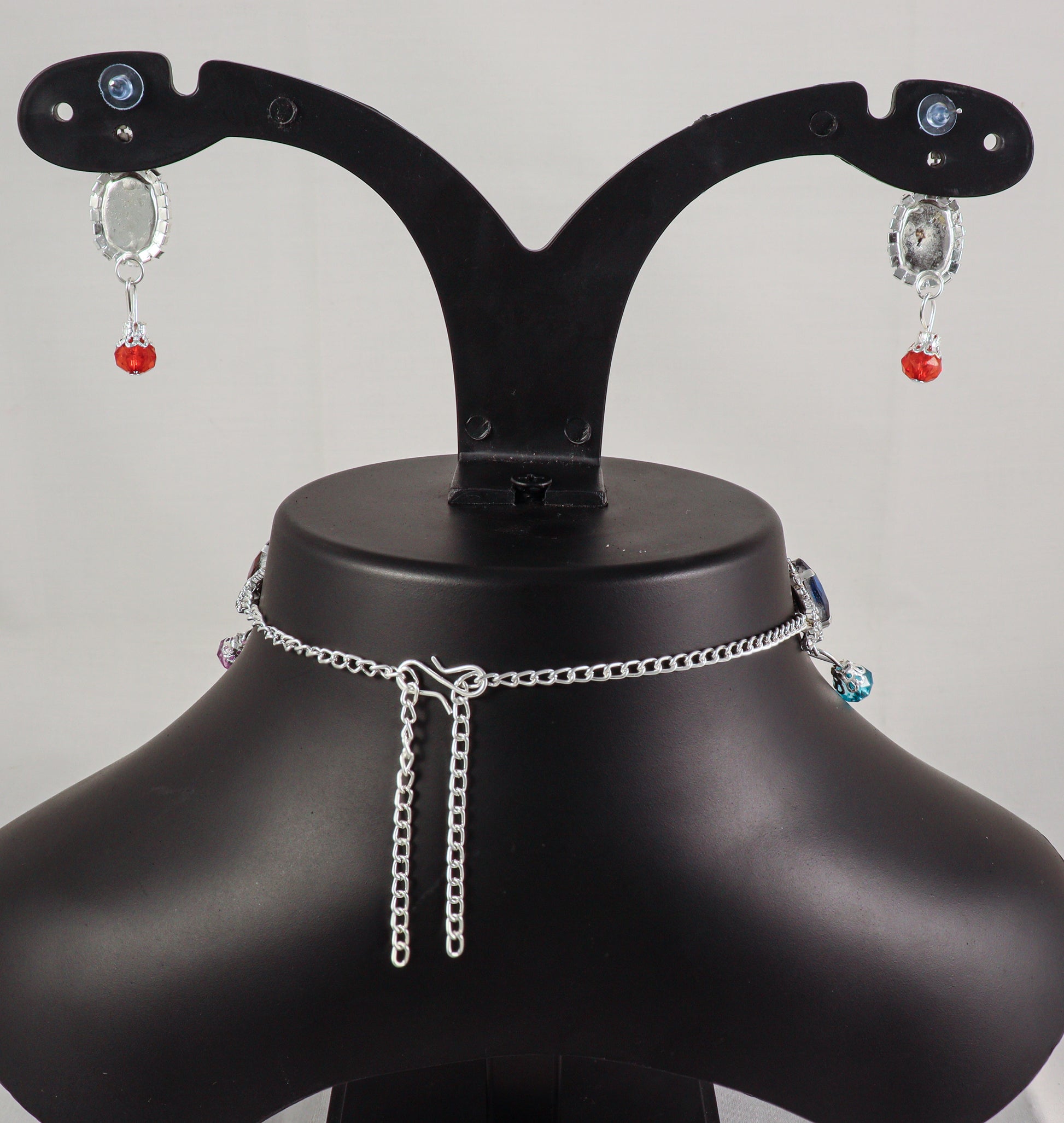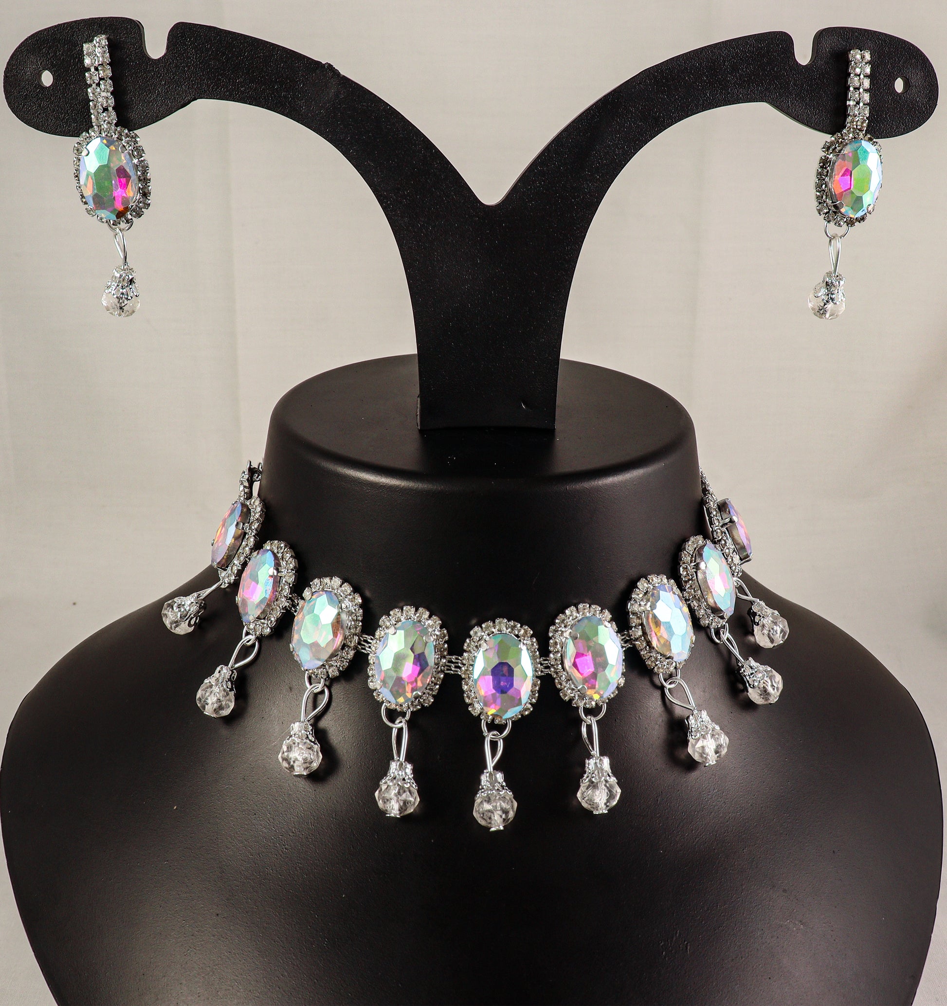urn heads with this dazzling multicolor crystal jewelry set, featuring a bold statement choker and matching drop earrings. The choker showcases an array of vibrant oval-cut gemstones—red, blue, green, yellow, iridescent, and more—each framed in sparkling rhinestones and adorned with delicate dangling crystal drops.